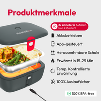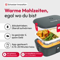 Erwärme deine Mahlzeit immer und überall innerhalb weniger Minuten dank des eingebauten Akkus.