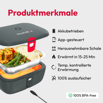 Erwärme deine Mahlzeit immer und überall innerhalb weniger Minuten dank des eingebauten Akkus.