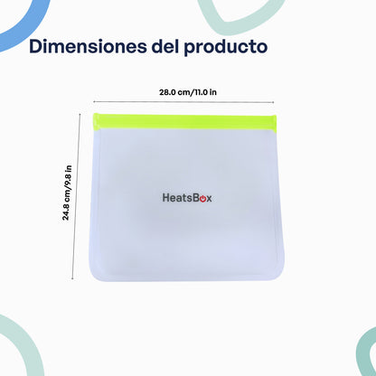 Las bolsas a prueba de fugas están hechas de materiales 100 % aptos para alimentos. Además, al igual que todos los productos HeatsBox, son 100 % libres de BPA.