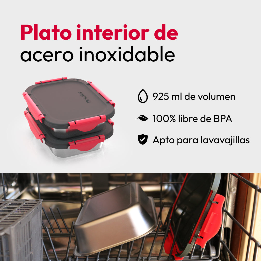 Almacenamiento y limpieza sencillos después de la comida. El recipiente interno es apto para el refrigerador, congelador, lavavajillas y horno.