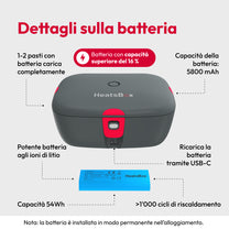 Riscalda i pasti in qualsiasi momento e in qualsiasi luogo in pochi minuti grazie alla batteria ricaricabile integrata.