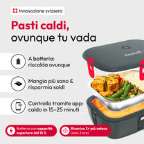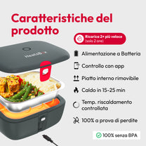 Riscalda i pasti in qualsiasi momento e in qualsiasi luogo in pochi minuti grazie alla batteria ricaricabile integrata.