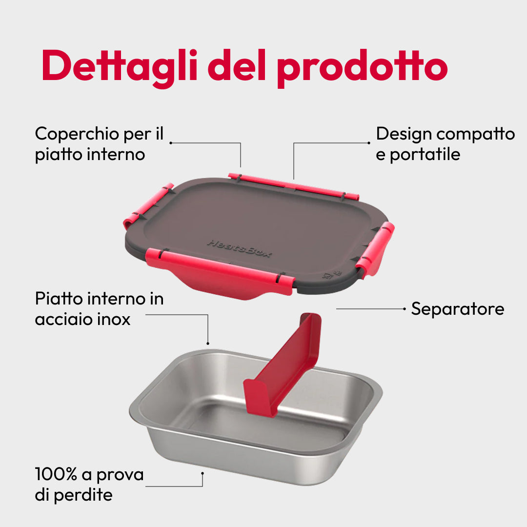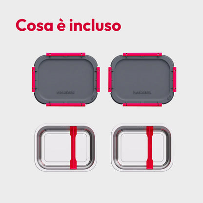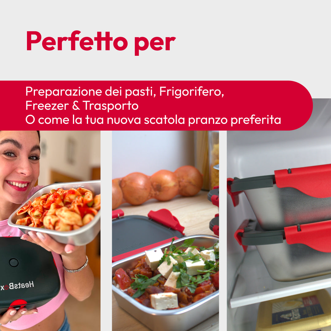 • Include 2 vassoi interni con coperchi e divisori per diversi pasti.