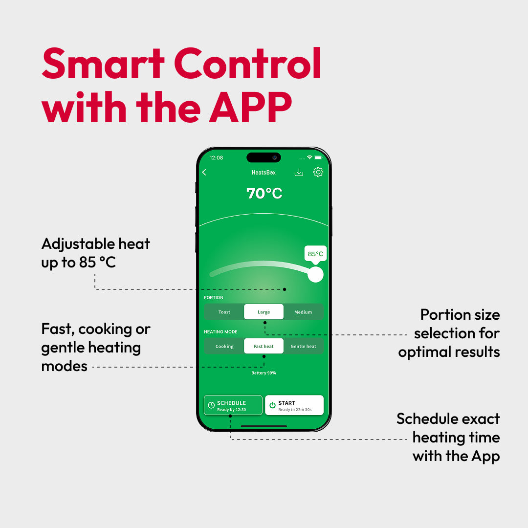 Choose your preferred heating time with the app or manual controls, and your meal will be perfectly warmed in just 15-25 minutes, wherever you are.