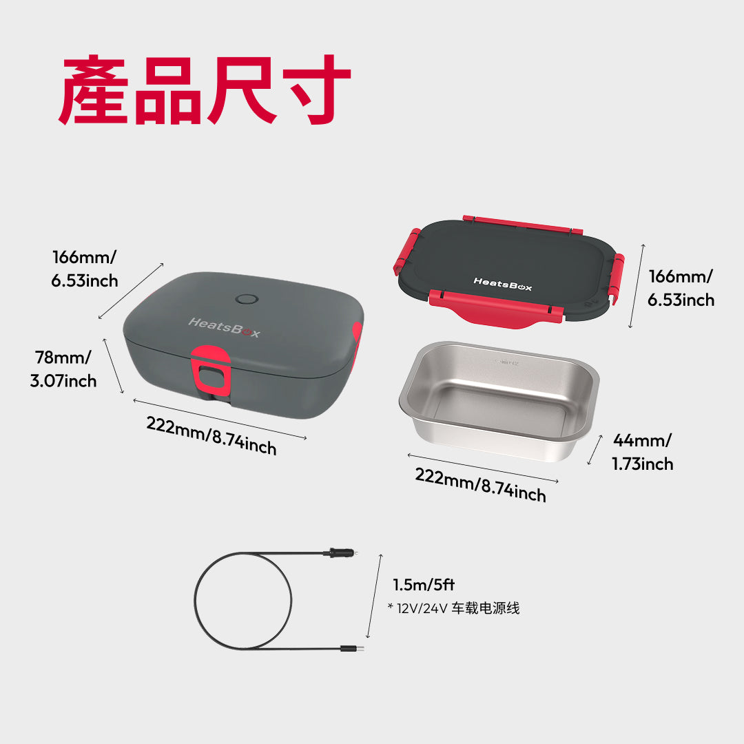 1x HeatsBox 1x HeatsBox盒蓋 1x 內膽 1x 內膽蓋 1x 隔板 1x 12/24V 电源线 1x 用戶手冊